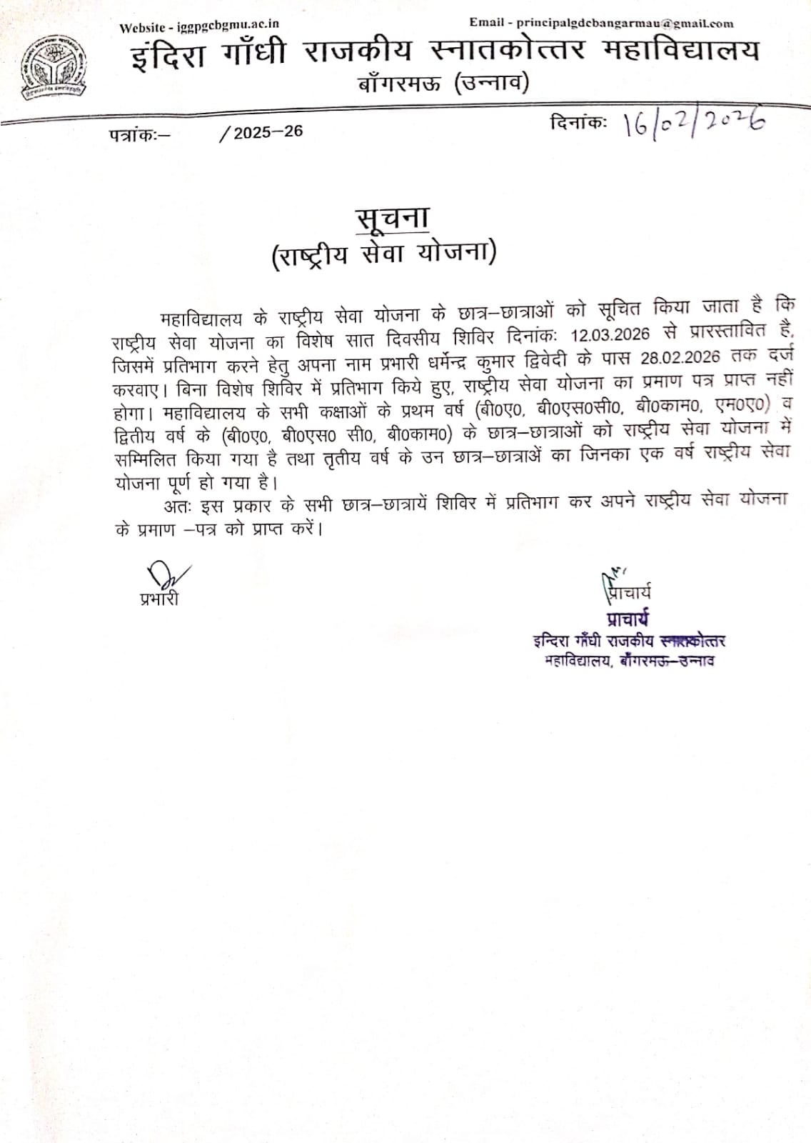 Welcome to the Indira Gandhi Government P.G. College website! It is my pleasure to welcome you to our vibrant learning community. The Indian concept of education is multifaceted, emphasizing spiritual and moral development alongside knowledge acquisition...