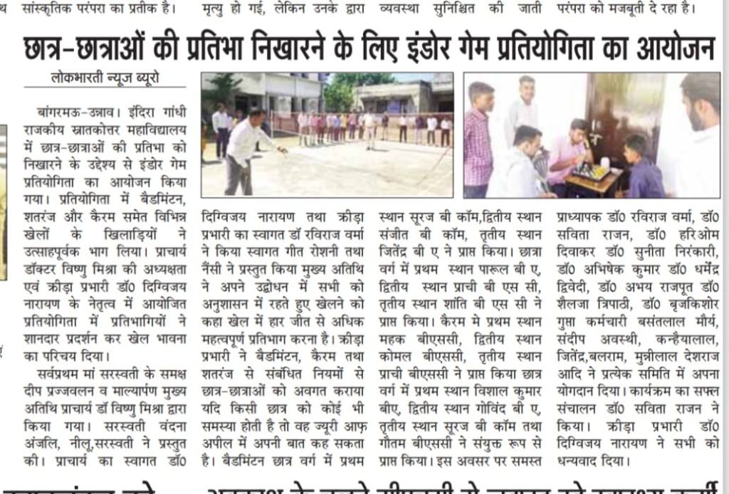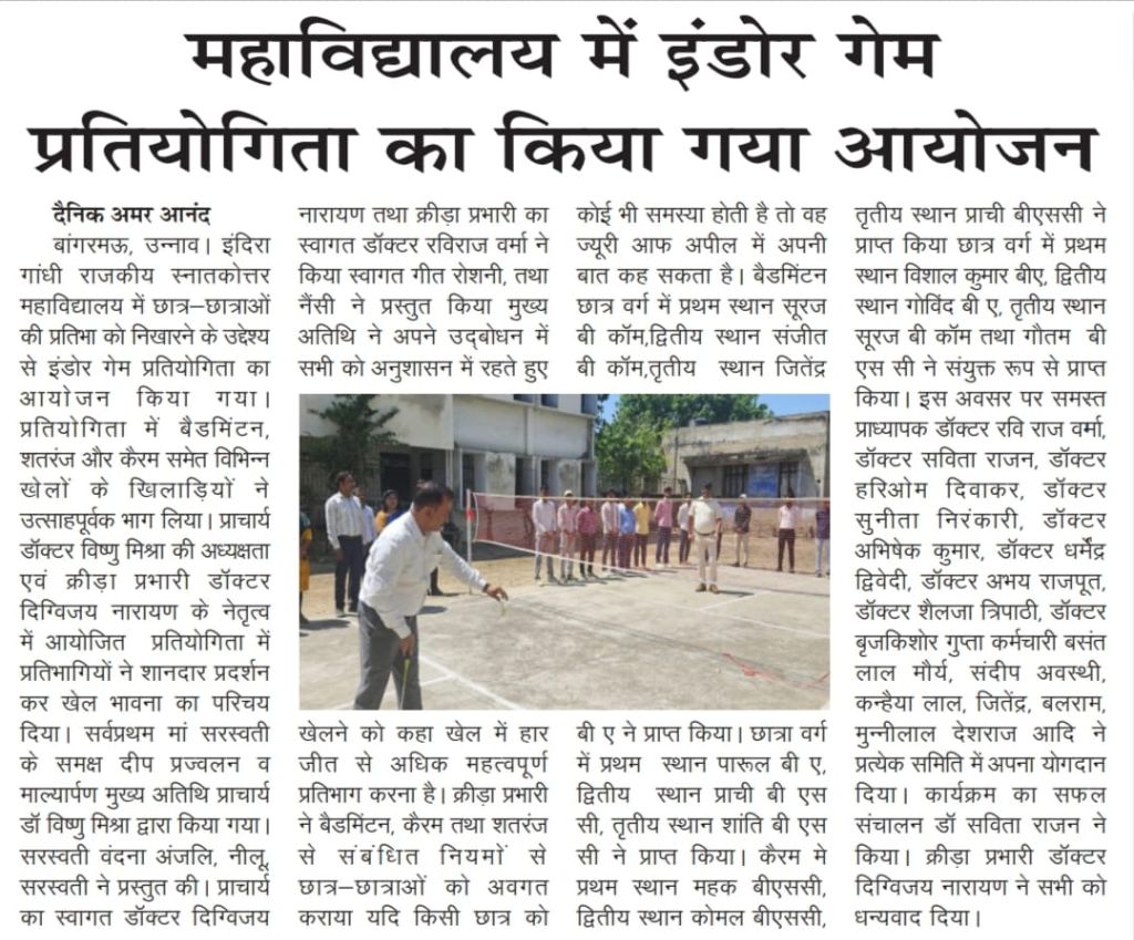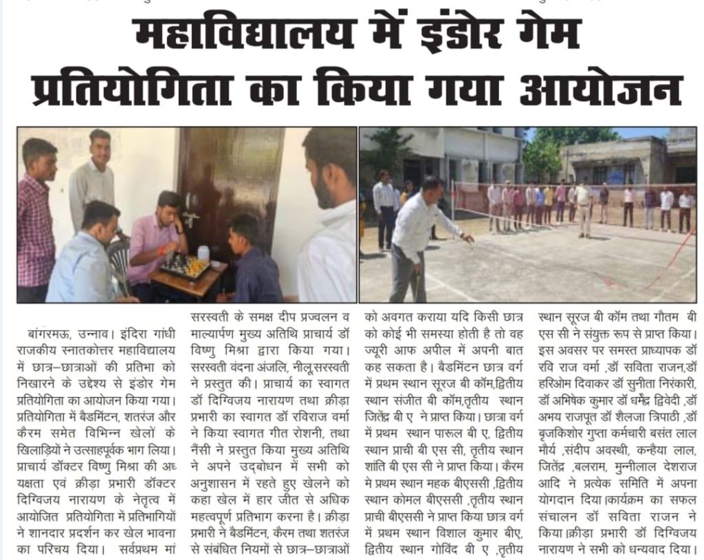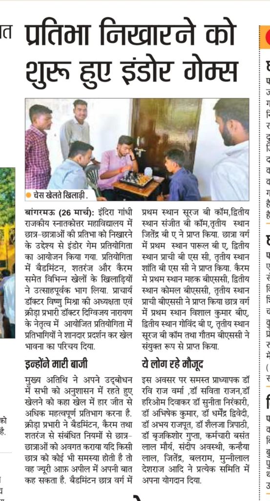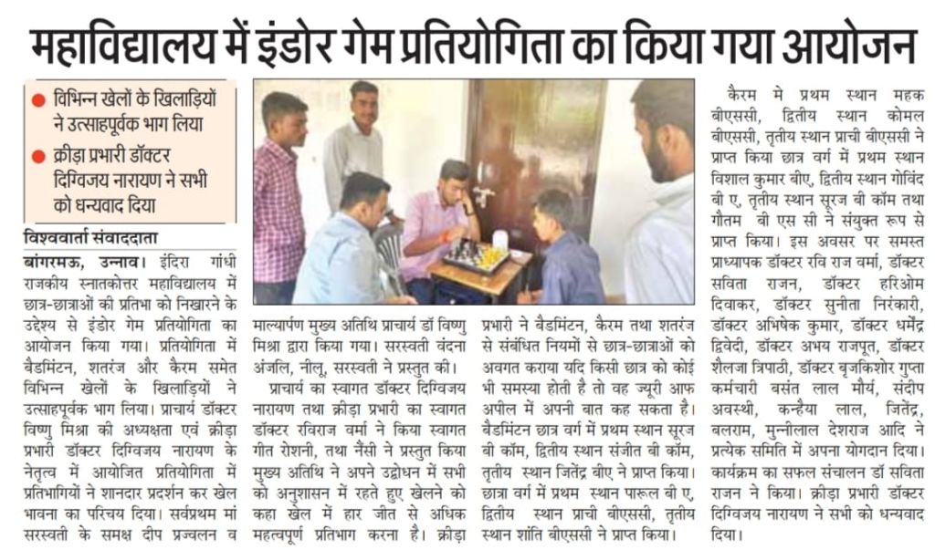 इंदिरा गांधी राजकीय स्नातकोत्तर महाविद्यालय में छात्र-छात्राओं की प्रतिभा को निखारने के उद्देश्य से इंडोर गेम प्रतियोगिता का आयोजन दिनांक 25/03/2026 को किया गया। प्रतियोगिता में बैडमिंटन, शतरंज और कैरम समेत विभिन्न खेलों के खिलाड़ियों ने उत्साहपूर्वक भाग लिया। प्राचार्य डॉक्टर विष्णु मिश्रा की अध्यक्षता एवं क्रीड़ा प्रभारी डॉ० दिग्विजय नारायण के नेतृत्व में आयोजित प्रतियोगिता में प्रतिभागियों ने शानदार प्रदर्शन कर खेल भावना का परिचय दिया।